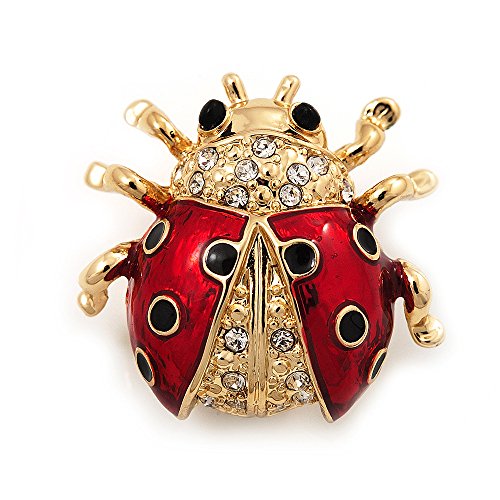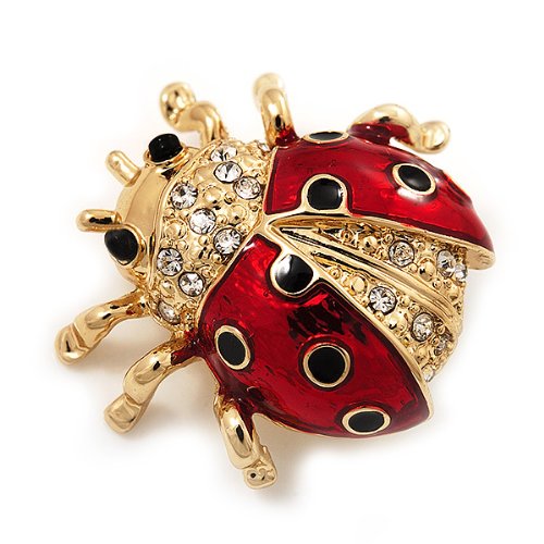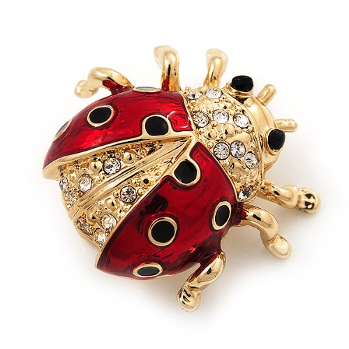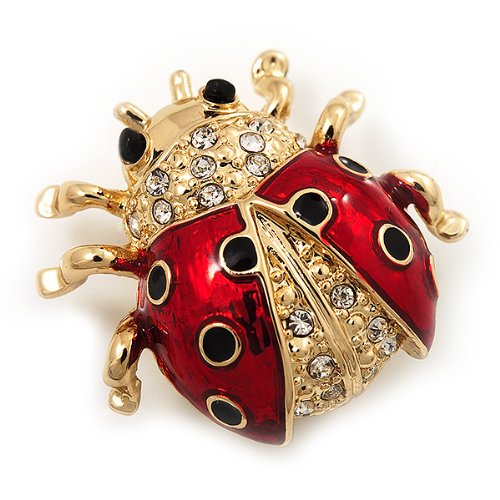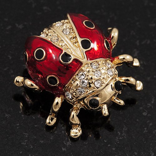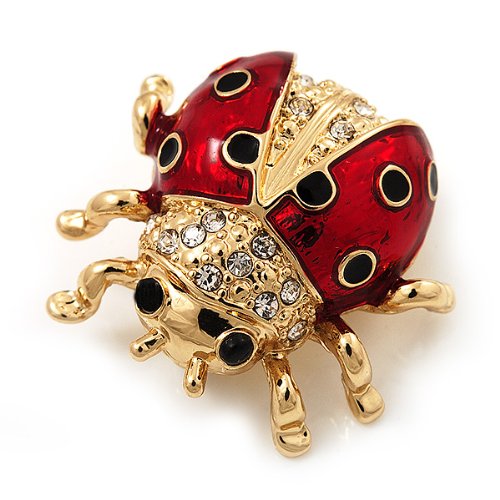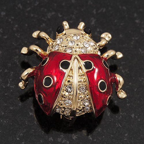 -. Title : Black/Red Enamel Crystal Lady Bug Brooch In Gold Plated Metal - 2cm Length