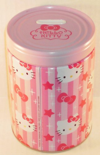 Round metal bank featuring Hello Kitty. Tin Box Company printing inks comply with U.S. Consumer Product Safety Commission 16 CFR 1303 Ban of Lead Containing Paint and Certain Consumer Products Bearing Lead Containing Paint. Product is tested and is in compliance with the new Childrens' Product Safety Information Act standards in effect as of Aug 14, 2009. Please also note that all Tin Box Company products are naturally PVC-Free and BPA-Free.Feature
