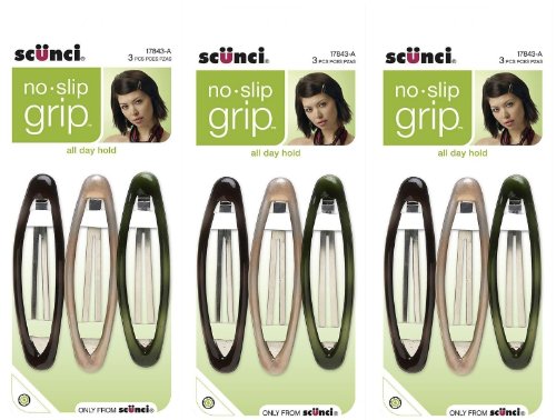 With scunci no-slip grip clippies at her fingertips a woman should never have a bad hair day. snap one of these oval clippies into place and your style stays all day. these easy to apply clips feature a rubber sleeve with our no-slip technology, so once you've put them in, they stay in. ideal for updos or side accents they secure stray strands with aplomb. 3 pack of neutral shades for casual style.Feature