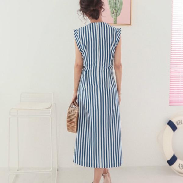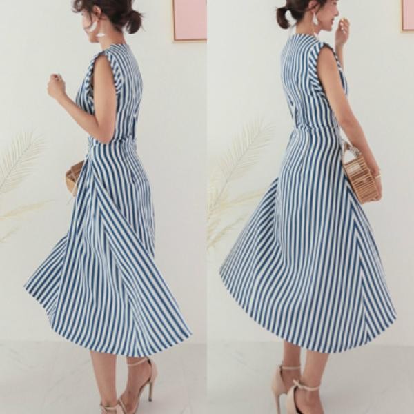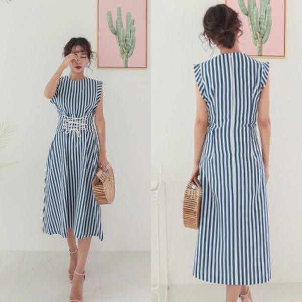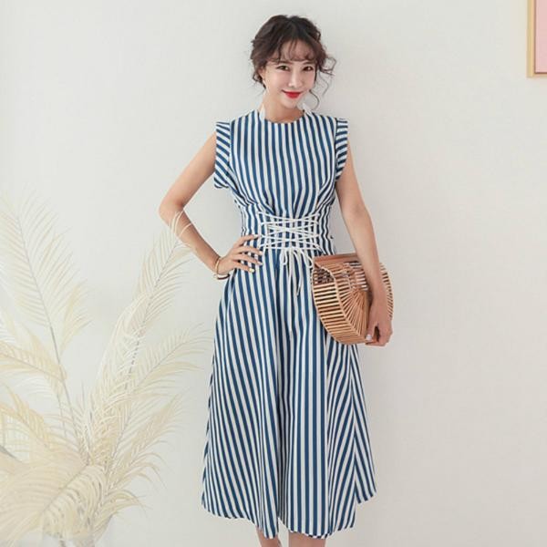 カジュアルスタイル ストライプ レースアップ ノースリーブドレス コルセットワンピース