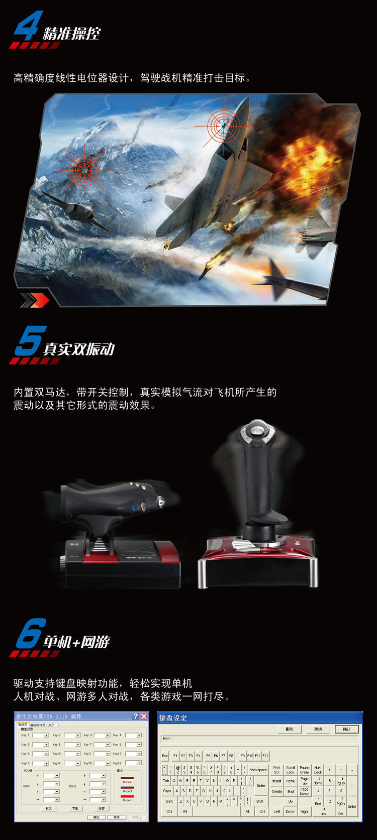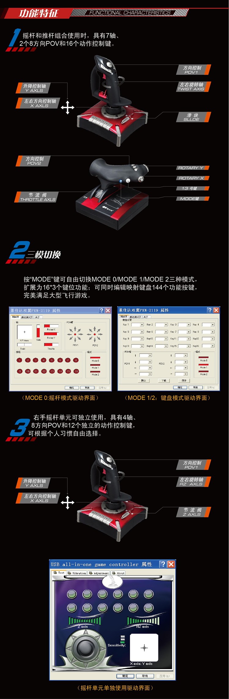 6 with 7 axis 2 8 direction key cooly cap and 16 independent movementcontrol keys and can realize 144 function keys combinations.