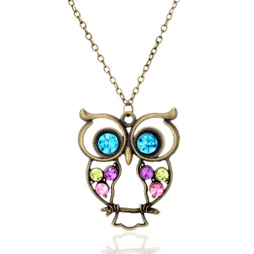 - Title : Vintage, Retro Colorful Crystal Owl Pendant and Long Chain Necklace with Antiqued Bronze/Brass Finish