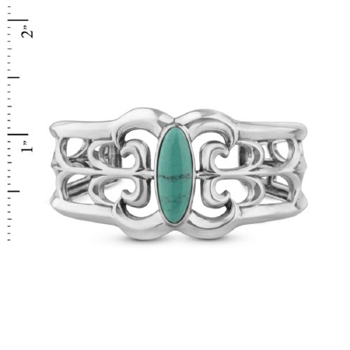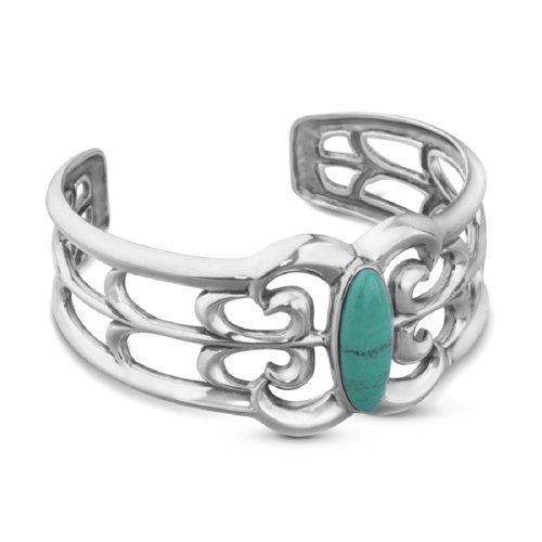 A turquoise treasure! In stunning style ornate filigree sterling silver scrolls cascade from a center blue-green stone of genuine turquoise in this masterfully crafted cuff. Traditional medium fit. *Note: Color may vary due to characteristics of the natural stone. Our jewelry features gemstones from around the world. Many natural gemstones undergo treatment as part of the finishing process to enhance the beauty or durability of the stone. Stone treatment is an accepted industry practice if done ethically and with full disclosure. When any natural, treated stone is featured in a piece of our jewelry, the treatment method is listed in the Product Specifications area. Please see our Detailed Seller Information for more information. Turquoise stone has been stabilized to improve the durability of the stone. No dyes have been added to the stone to enhance color. Our jewelry is proudly made in America with US and imported parts. We do our part for the environment by crafting our jewelry from recycled .925 sterling silver.Feature