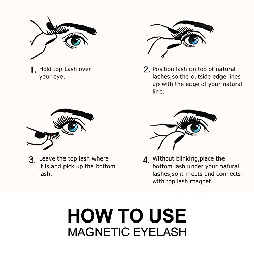 1. If needed, trim the length of the lashes to fit your preferred length. Carefully bend the magnetic lash line to fit your natural curve. 2. Gently take the top magnetic lashes piece and position it on top of your natural lashes with the outer edge of the magnetic lashes aligned to the outer edge of your natural lash line. 3. Leave the top magnetic lashes in its place, and gently pick up the bottom magnetic lashes. 4. Keeping eyes open without blinking, position the bottom magnetic lashes under your natural lashes to align the magnets together to connect the top and bottom magnetic lashes.