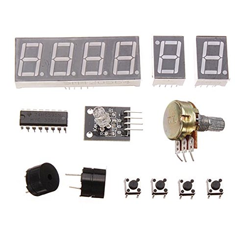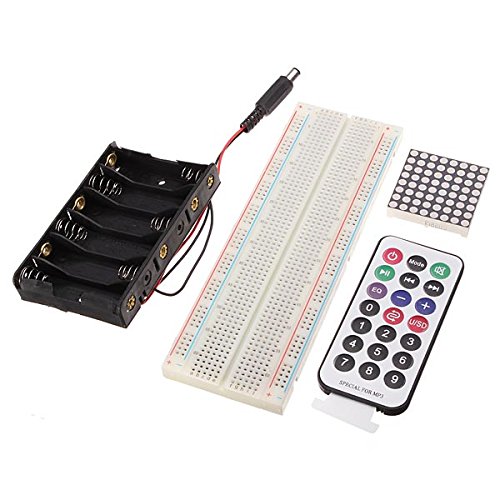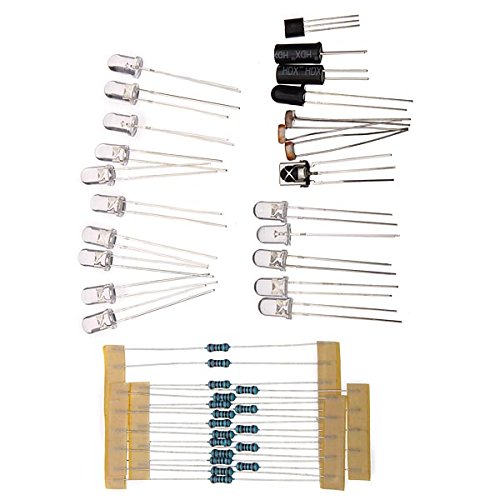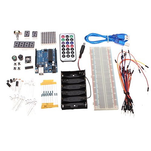 1 x Arduino UNO 2012 1 x 830 breakboard 1 x Storage components box 5 x Red LED 5 x Yellow LED 5 x Green LED 8 x 220 Ohm Resistor 5 x 1K Resistor 5 x 10K Resistor 1 x Active buzzer 1 x Passive buzzer 4 x Button switch 2 x Digital tube 1 x 6 AA Battery holder 1 x 4 Digital tube 2 x Ball switch 3 x Photoresistor 1 x Adjustable resistance 1 x Flame sensor 1 x Infrared receiver 1 x LM35 temperature sensor 1 x 74H595 1 x 8*8 Matrix 1 x USB cable 30 x Colorful breakboard cable 1 x Mini remote control