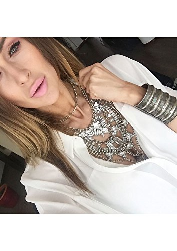 Features & Benefits: A large, bold multi row chain necklace in silver, adorned with rhinestones in clear color, suitable for both formal and informal occasions.