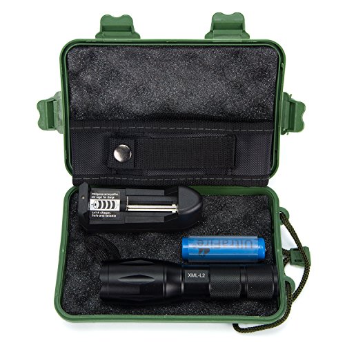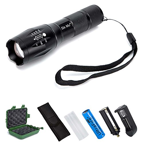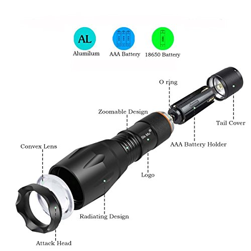 Ultra Bright Professional Grade Tactical LED Flashlight + 1 18650 Rechargeable Lithium Ion Battery + 18650 Battery Sleeve +1 Lithium Battery Charger + Case+ 3 X AAA Battery Holder. Suitable as a gift