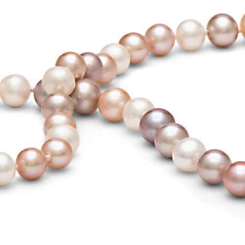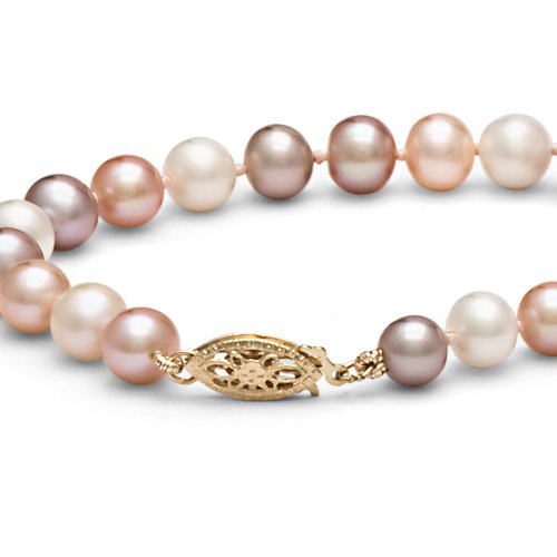 This stylish necklace is composed of very round to near round (AAA) 6.5-7.0 mm multicolored freshwater cultured pearls with a smooth surface. Each strand is finished with a floral filigree fish hook clasp made of solid 14k white or yellow gold, which you can choose from. You can also select between lengths of 16 inches (pearl choker) and 18 inches (princess necklace).Feature