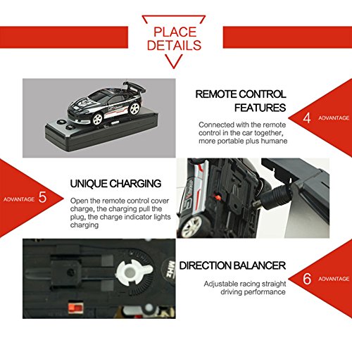 -. Feature : If you love remote controlled toys, you will love the super mini remote controlled racing car. The remote control model car is ideal for the home or office, you can zoom past your friends or colleagues. The car is 2ch rc control goes backward and forward, steers left and right. / This rc model is not a toy and is not suitable for children under 8 years old. Carefully read the instruction before any use, if you are a beginner, it's advisable to be assisted by an experienced adult. / 27mhz wireless radio frequency controlled. 1:58 scale suitable for indoor and outdoor control. / Built-in rechargeable battery, directly recharged by remote controller. 2ch rc control goes backward and forward, steers left and right. / Remote control distance: about 8-12m; suitable ages: above 3 years old.