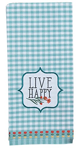 - Tea towel features an embroidered live Happy design on gingham fabric