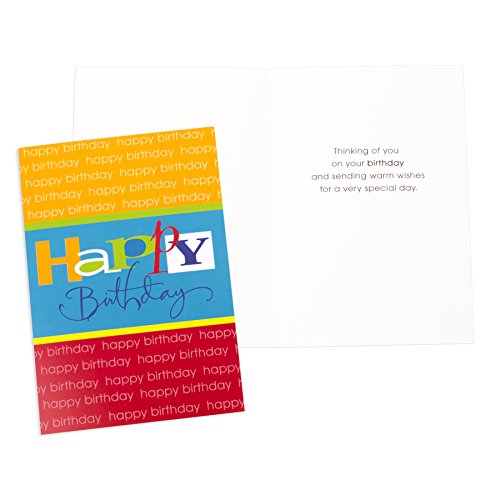 Festive birthday card set features four colorful designs and a celebratory birthday message, including bright balloons, a "Happy Birthday" pattern covering the card, a cake with candles, and "Happy Birthday" lettering in whimsical text.