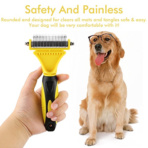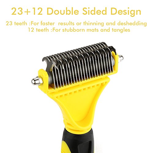 ❤ GENTLE & SAFE - The curved 23 + 12 teeth double sided head allows you to remove the toughest knots, mats and tangles without hurting your pets.The 12 teeth side for stubborn tangles and the 23 teeth side for faster results or thinning and de-shedding.