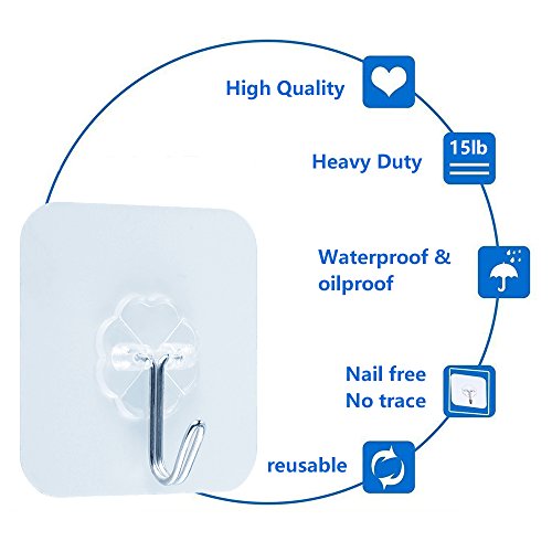 Features: Supper powerful adhesion Strong heavy duty. Removable Reusable hooks. Thin and Clear Nice decoration. No drill no screw Damage free on the wall. Waterproof Oil-proof. How to install: Clean and completely dry the surface where you intend to stick the hook Peel the adhesive tape cover off. If the ambient temperature is below 68℉, use the dryer to heat the adhesive tape to 86℉. Press the hook for one minute. Highly recommend to wait for 24 hours to get the strongest adhesion. Note: If possible, DO NOT sticks the hooks on the PAINTED WALL or WALLPAPER. Because the hooks with strong adhesiveness, it would be pulled down the painted wall or wallpaper if the weight over duty. Please Do Not Hang Valuable And Fragile Items. Normally, this hook can hold up to 15 lbs/7kg load-bearing on the smooth surface. But we don't suggest to hang heavy things more than 15lb/7kg for a long time. How to remove: 1. Use the hair dryer to heat the product about 3 minutes. 2. Insert a knife into the backing tape, and peel the tape off. 3. Apply the cleaning agents such as medical alcohol, nail paint remover onto the surface of the remaining tape, and wait for 1 minute. 4. Wiped the remaining tape off immediately. Package list: Clear adhesive hooks * 10 0 |