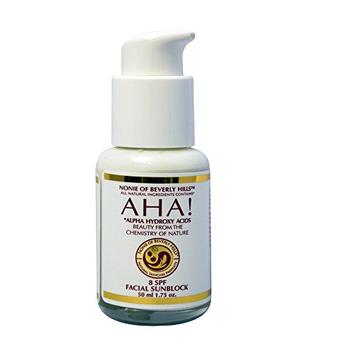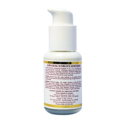 8 SPF Sunblock containing all natural ingredients. Contains 5% Alpha Hydroxy Acids. Contains Vitamins A, B, C, & E. Titanium Dioxide and Zinc Oxide to provide a full spectrum sunblock.