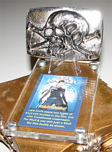 This is a Replica Skull and Crossbones Belt Buckle like the one worn by Lara Croft in Tomb Raider. This buckle is Silver in color, made out of solid metal, weighs 7 ounces and measures; 4 inches wide by 2.5 inches high by .5 inches thick at skulls head which is embossed so it extrudes out from base. The backside contains a metal belt loop and metal prong so you can attach to a belt. This is a standard type buckle and will work on most belts.Buckle does not come with plaque as shown in picture. The plaque is available as a optin. See other items or e-mail for pricing. The Plaque is a Acrylic Screwdown plaque with easel to set buckle on for display when not worn. It contains a picture of Lara Croft and basic information about the buckles use in film and comics. The Plaque measures 3.5 inches wide by 5.5 inches long. Easel stands 2 inches tall and is 1.75 inches deep at base.The Tomb Raider buckle is also available with the just the Skull image. Both styles of Metal buckles are available in both Gold and Silver. Belts, Holsters and replica guns are also available for your Tomb Raider Costume. E-mail or see other items for details.