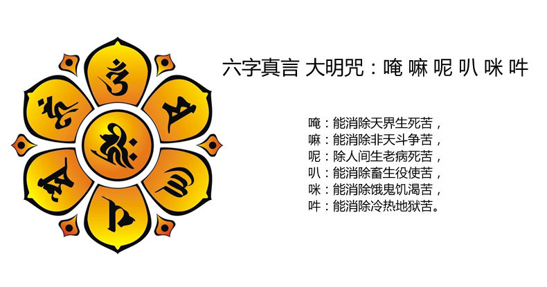六字真言大明咒,发音没有规定,有多种版本,常见的是:唵(ong)嘛(ma)呢(nī)叭(bā)咪(mī)吽(hōng)。是观世音菩萨咒,源于梵文中,代表一切诸菩萨的慈悲与加持。六字真言是“唵啊吽”三字的扩展,其内涵异常丰富、奥妙无穷、至高无上,蕴藏了宇宙中的大能力、大智慧、大慈悲。此咒即是观世音菩萨的微妙本心。代表观音(四臂观音)关闭六道之门,使众生从痛苦中解脱,往生清净极乐净土的纯佛教理念。“六字真言”是观世音的名号,见佛陀语录《佛说庄严宝箧经》和《华严经陀罗尼》、等。在《西游记》当中,孙悟空被压在五行山下后想挣脱出来,佛祖在山上贴了张写有唵嘛呢叭咪吽的字条贴在山上,孙悟空就出不来。