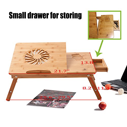 -. Feature : MULTIFUNCTIONAL BAMBOO LAPTOP DESK 100% Recommended natural bamboo, environment friendly and sturdy; used for surfing the Internet, eating food, coloring, reading, doing homework on the bed, sofa, recliner, floor, car, etc. moisture resistant and easy to clean. / ADJUSTABLE HEIGHTS & WIDTH - Adjustable tilt and legs for better viewing experience. 5 slots to adjust, one more tilting position to choose comparing to other desks. / SPECIAL GREAT POWERFUL HEAT DISSIPATION DESIGH- Unique USB Fan and beautiful hollowed out design for better heat dissipating. / CONVENIENT DESIGN - Worry-saving Cup-Groove. Small drawer for storing pen, note pad or phone , A stopper prevents your laptop from slipping from the desktop / PORTABLE LAPTOP DESK - Selection of material and quality determines the P.R.Ice of self-confidence. Product Size: 21.7''L x 13.8''W x 11.4''H (55 x 35 x 29 cm). Lightweight and foldable, easy to carry. Note: 12 months warranty.