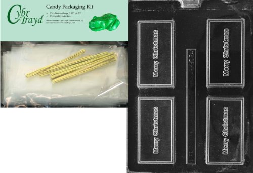 Cybrtrayd "Merry Christmas" Business Card Chocolate Candy Mold with Packaging Bundle of 25 Cello Bags, 25 Gold Twist Ties and Chocolate Molding Instructions