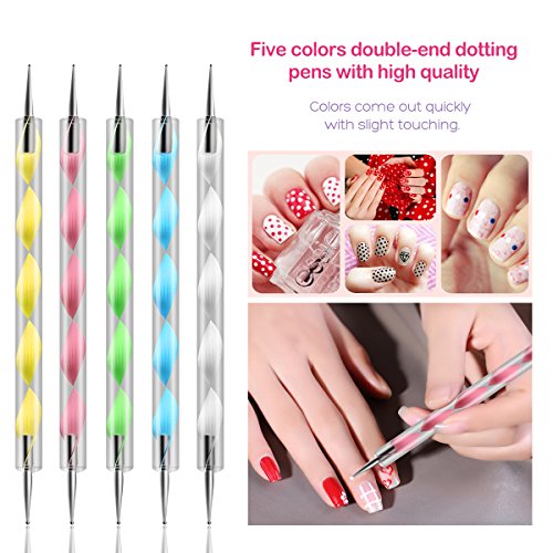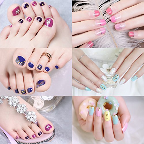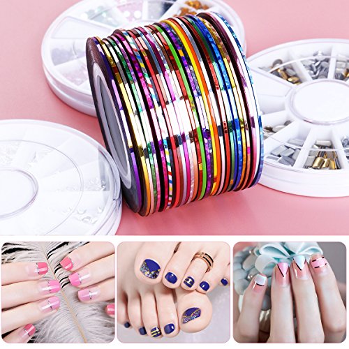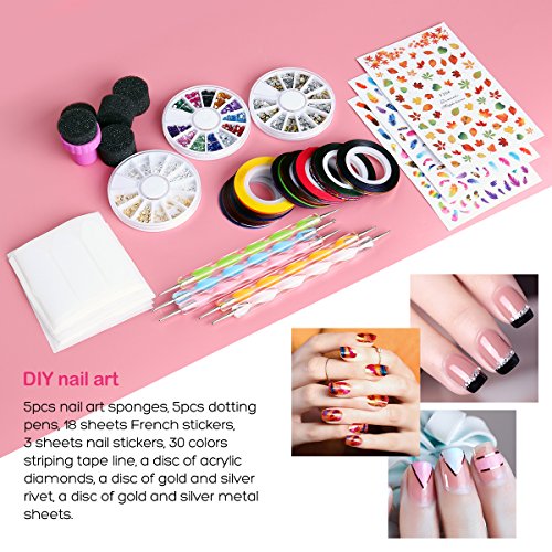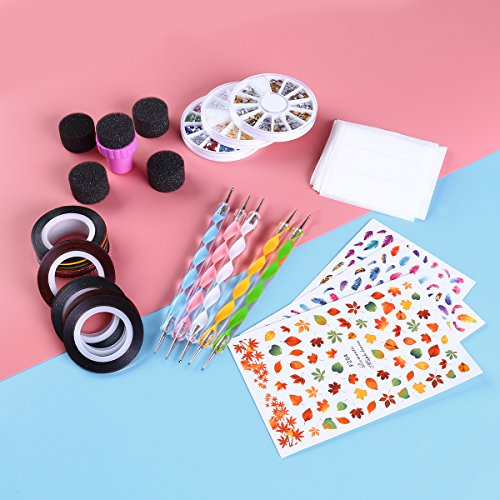 Package Includes: 5 Gradient nails sponges 1 Box rhinestone decorations 1 Box gold and silver metal slices decorations 1 Box gold and silver stud decorations 30 Rolls of striping tape 18 Tape line nail stickers 5 Dotting pens 3 Nail art stickers 0