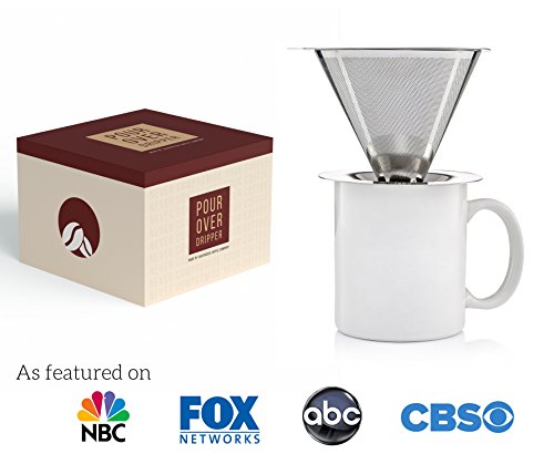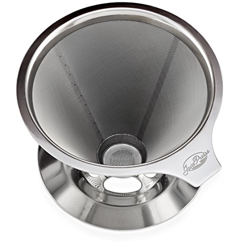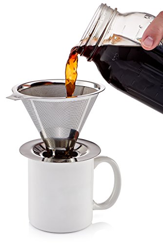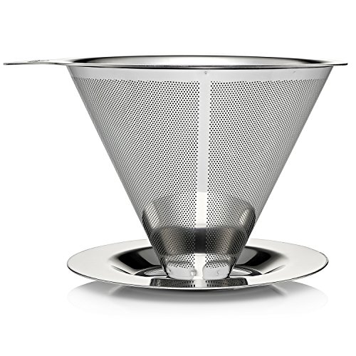 -. Feature : Exclusive Double Walled Paperless Filtration System prevents 99.9% of coffee grounds from entering your mug during the extraction process, enabling you to enjoy a clean, sustainable, and eco-friendly cup of coffee or two without using disposable paper filters like required to get the best results from Melitta, Chemex, Bee House, or Hario V60 coffeemakers. / Widened 4-Inch Set Base will sit comfortably on top of most thermoses, mugs, carafes, small pots, pitchers and decanters, allowing you to customize your experience and brew fresh roasted coffee directly into pots and vessels you already own. / Purposefully crafted with a BPA Free Dishwasher-Safe 18/10 permanent stainless steel metal mesh grid, our pour-over funnel cone series takes 20 seconds to clean up after use. Imagine a peaceful, personal, and natural morning coffee or tea routine that doesn't involve you doing dishes or fixing up expensive electric machine equipment. / Original elegant design inspired by the Vietnamese eliminates fragile glass or ceramic parts, long plastic wire cords, and bulky fittings from your brewing experience altogether. All you need is hot water and ground coffee to enjoy your first single cup of delicious manual barista slow-brew in less than 60 seconds. / What Our Amazon Customers Say: "I LOVE THIS COFFEE DRIPPER!" "No need for instant coffee anymore, this dripper makes real coffee just as quick!" "Outstanding product that delivers top notch flavor!" "So much better designed than the older one that I'd been using" "This pourover kone should literally last a lifetime!" "Perfect for the perpetually caffeinated!!" 100% Lifetime Money-Back Guarantee. Order today while supplies last.