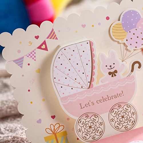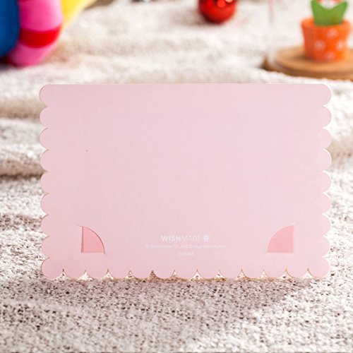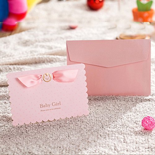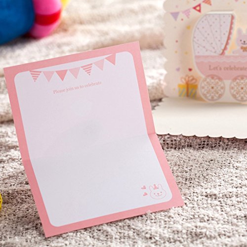 Pink INVITATION COVERS (POCKETS) is 6.7 x 4.5 inch, which is made of thick iridescent cardstock, decorated with 3d cartoon figures, pink ribbon and hot stamping words.