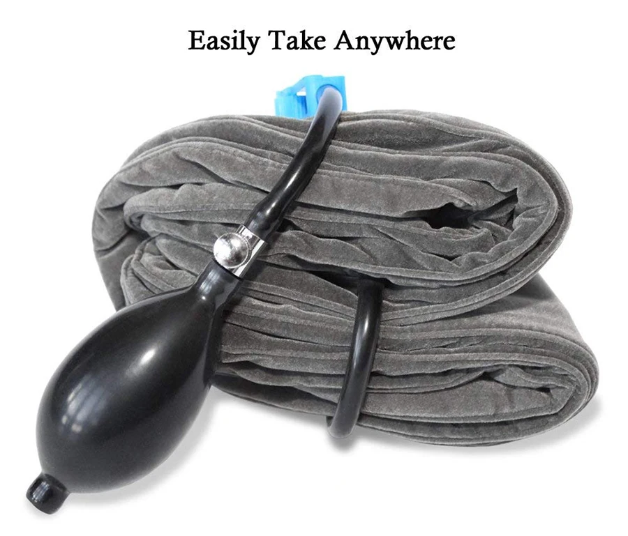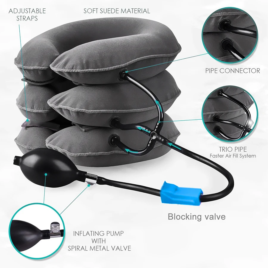 FASTER AIR FILL SYSTEM! Unlike other devices our Adjustable Neck Traction Pillow has a 3 pipe-design that makes it easier for you to inflate according to your desire fit & the air stopping ball feature makes it AIR LEAK PROOF. very EASY TO USE.