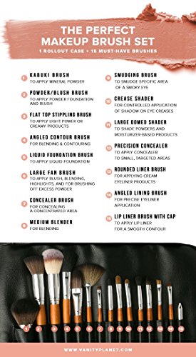 -. Feature : Includes 15 BRUSHES to give you a versatile and comprehensive styling experience, from applying your favorite blush to quick concealer touch ups / Ultra-soft, PREMIUM SYNTHETIC Cruelty-Free BRISTLES allow for smooth, controlled, and streak-free application of dry, cream, and liquid based products / EASY TO STORE, so you can have your makeup arsenal ready, wherever your busy schedule takes you / The roll-out case's PROTECTIVE FLAP keeps your brushes CLEAN AND COLLECTED / Sturdy, yet light, the BIRCHWOOD HANDLES are made with a comfortable design for seemingly effortless movements