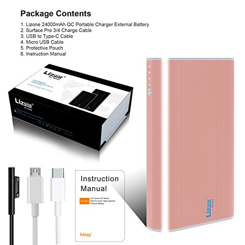 Package Contents : Lizone 24000Ah QC Portable Charger External Battery Power Bank, Surface Pro and Book Charging Cable, USB to Type-C Cable, Micro USB Cable, Instruction Manual.