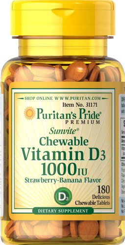 -. Binding : Health and Beauty -. Brand : Puritan's P.R.Ide -. EAN : 0025077311712 -. Feature : We are the manufacturer and the only authorized seller of this product. / This product has been made with the highest quality ingredients available. / Over 40 years in business and 19 million customers served. / Satisfaction guaranteed or your money back. -. IsAdultProduct : 0 -. Label : Puritan's P.R.Ide -. Manufacturer : Puritan's P.R.Ide -. Model : No Model -. MPN : 31171 -. PackageQuantity : 1 -. PartNumber : 31171 -. ProductGroup : Health and Beauty -. ProductTypeName : HEALTH_PERSONAL_CARE -. Publisher : Puritan's P.R.Ide -. Studio : Puritan's P.R.Ide -. Title : Puritan's P.R.Ide Chewable Vitamin D3 1000 IU-180 Tablets -. UPC : 025077311712