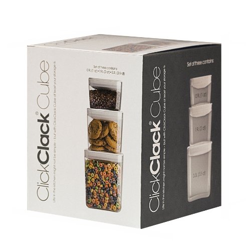 For more than twenty years ClickClack has been the leading name in aesthetically pleasing and highly fictional kitchen storageware. World renowned for ease of use, air-tightness and durability, the Cube is the latest addition to the ClickClack family of designer storage containers. The Cube is designed to maximize storage space in your pantry or on the countertop and make life easier in your kitchen. The Cube storage container features a crystal-clear base with curved corners and a white soft-toggle top. It is perfect for storing rice, pasta, flour, sugar, salt, coffee, beans, cereal, crackers, chips and more. You can save money by buying food in bulk and keeping it safe and fresh in a ClickClack storage Cube. Each Cube container is durable, airtight, stackable and BPA free. ClickClack's Cube is made for dry food storage, and is not intended for microwave or freezer use. To clean, hand wash lid (remove airtight diaphragm on lid base first and allow to dry thoroughly before snapping back into place) and base in warm soapy water.