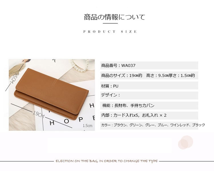 商品番号:WA037商品説明:◆伸縮性:有り◆厚さ:普通◆素材:PU、ポリエステル、金属◆財布のサイズ:19X19.5X1.5cm約◆内部:カード入れX5 お札入れX2◆色:ブラウン、ダークグリーン、グレー、ネイビー、ワインレッド、ブラック◆重量:150g約◆商品内容:1x財布特徴:【軽量、携帯便利】財布が軽量で、携帯便利です。出掛けに最適!!カード、お札、写真などが収納できます。【ファッションなデザイン】欧米風なファッションの純色な財布なので、通勤や通学にも適用します!!【多彩な色】たくさんの色が選択可能ですが、簡単的にファッションなデザインの財布です。おすすめです。