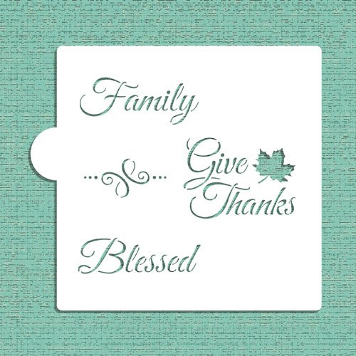 - Size of pattern is: approximately 2.5 inches wide and 1 inches high for Family and Blessed; 2.4 inches wide and 1.7 inches high for Give Thanks. Stencil plastic, not including thumb hold is: 5.5 inches high x 5.5 inches wide.