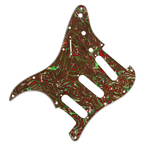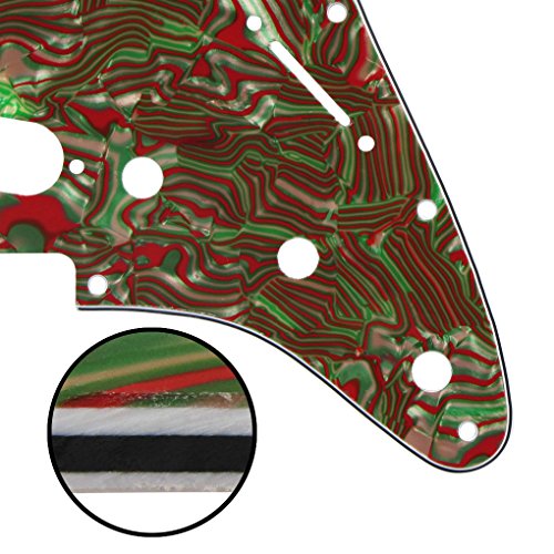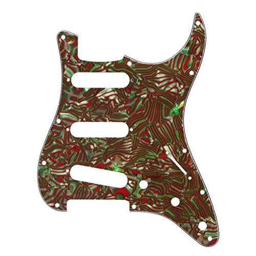 Product Description Feature: * For US Modern Fender Strat Stratocaster style guitar or similar.* With pure aluminum foil shield on the backside, not the common aluminum-foil paper on the market, better shielding property and anti-interference.* All materials are environmentally friendly, thermostability, no smell. Multi-layer plates are pressed under high temperature and pressures, to make them close integration between each layer, will not appear curly, deformation, or separation of different layers.* Excellent product process ensure the edge of the smooth and structured.Two layers of protective films on the front of pickguards, anti-scratch to protect the guitar.Specification:* Style: SSS(single/single/single coil) style pickguard; 11 screws holes in the side of pickguard.* Material: 3Ply Shell Plate and PVC* With pure aluminum foil shield.* Color: Red/Green Stripe* With protective film on the surface, while using please split it off.* Note:Item's color might be different from the picture because of the aberration.Package Includes:1 x guitar pickguard 0