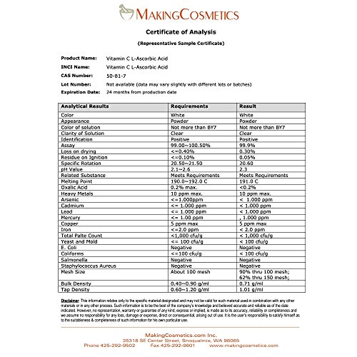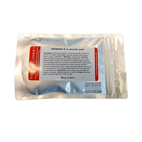 -. Binding : Health and Beauty -. Brand : MakingCosmetics -. EAN : 0885733676162 -. Feature : Water-soluble antioxidant. High active pure vitamin C powder for skin (l-ascorbic acid) / Packaging: Comes as one 50g bag (larger sizes in bulk available). Item is non-returnable, consists of raw materials / Use: Can be added to cosmetic formulas or finished cosmetic produdts. For external use only / INCI Name: L-ascorbic acid / CAS: 50-81-7 -. IsAdultProduct : 0 -. Label : MakingCosmetics -. Manufacturer : MakingCosmetics -. MPN : VIT-VITC-01a -. PackageQuantity : 1 -. PartNumber : VIT-VITC-01a -. ProductGroup : Health and Beauty -. ProductTypeName : HEALTH_PERSONAL_CARE -. Publisher : MakingCosmetics -. Studio : MakingCosmetics -. Title : Vitamin C Powder, USP-Grade (L-ascorbic acid) Pure - 1.8oz / 50g, For Use in Serums and Cosmetic Formulas -. UPC : 885733676162