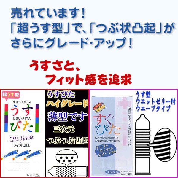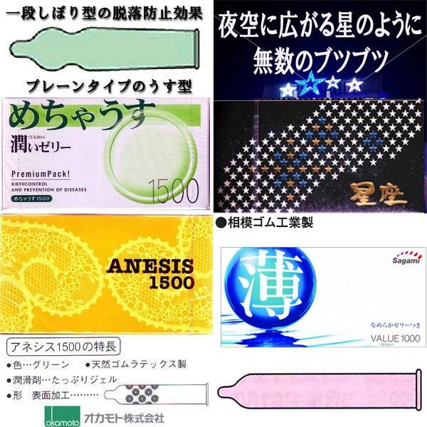 ・コンドームの適正な使用は、避妊に効果があり、エイズを含む他の多くの性感染症に感染する危険を現象しますが、 100%の効果を保証するものではありません。【あすつく条件】 ・当店営業日の12時までのご注文に対応 ・地域は限定あり ・お支払方法は「カード」「代引き」 ・時間帯の指定はできません 【詳細】 各メーカー人気のうす型コンドーム。 6箱色々お楽しみセット! ■すぐぴた(ジャパンメディカル) ・テープを引くだけの簡単装着 ・空気抜き不要 ・ウェットゼリー付 ・8個入り ¥1000 ■めちゃうす1500(不二ラテックス) ・一段しぼり型の脱落防止効果 ・うるおいゼリー加工による潤滑作用 ・12個入り ¥1500 ■星座 ・カラー:ピンク ・特徴:凸凹加工 ・潤滑剤:ウェット加工 ・個数:12個入 ■うすぴた ・うすさとフィット感を追及 ・つぶつぶ ・ウェットゼリー付 ・12個入り ¥1500 ■アネシス(オカモト) ・潤滑剤、ジェルたっぷり ・グリーンカラー ・12個入り ¥1500 ■薄 バリュー1000(サガミ) ・なめらかな使用感が得られる潤滑剤付き ・ストレートタイプ ・ピンク色 ・12個入り