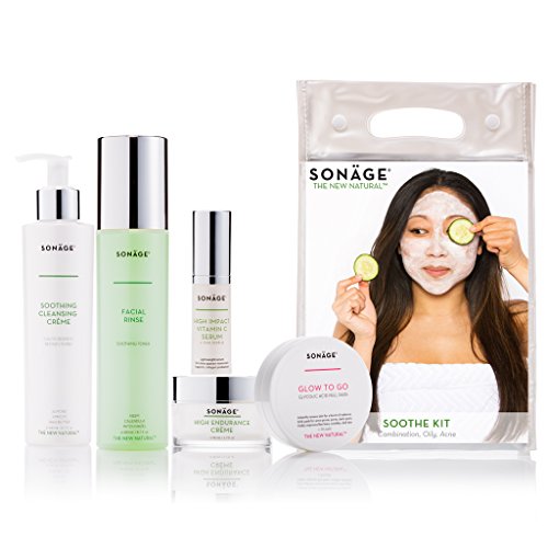 Soothe starter kit featuring a cleanser, toner, exfoliate, serum and moisturizer. Perfect for acne, sensitive, hyperpigmentation skin types. Bundle includes soothing cleansing crème, facial rinse, glow to go, high impact vitamin C serum and high endurance crème. Botanical ingredients. Paraben free. Cruelty free.Feature