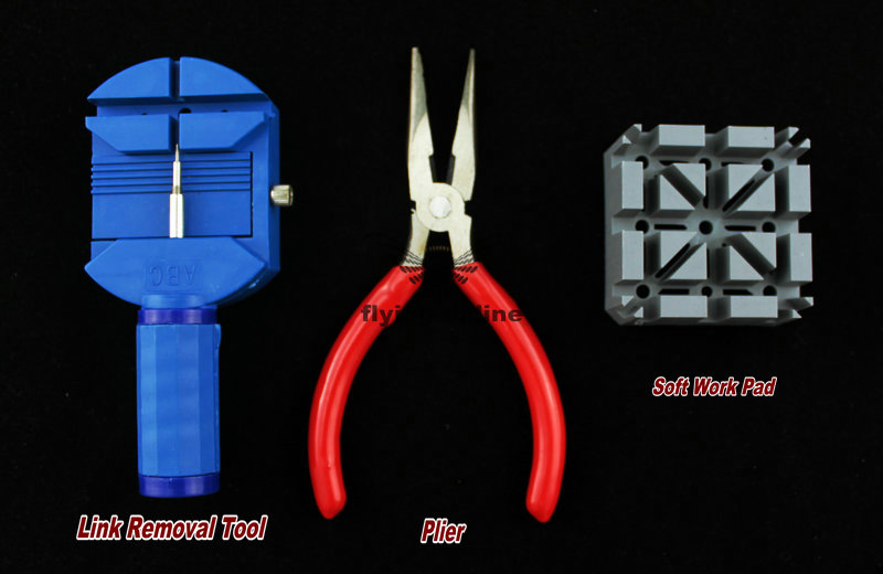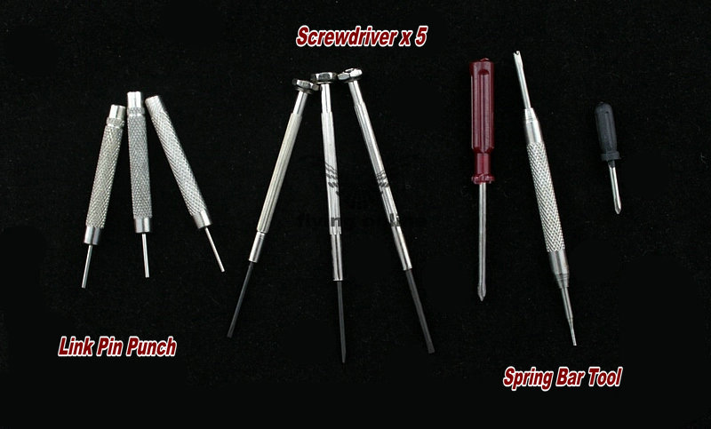 Includes: Link Removal Tool, Watch Case Opener, Soft Work Pad, Double Headed Hammer (nylon/steel), Case Opener Knife, Fine Nosed Tweezer, Plier, Spring Bar Tool & Link Pin Punch and Screwdrivers.