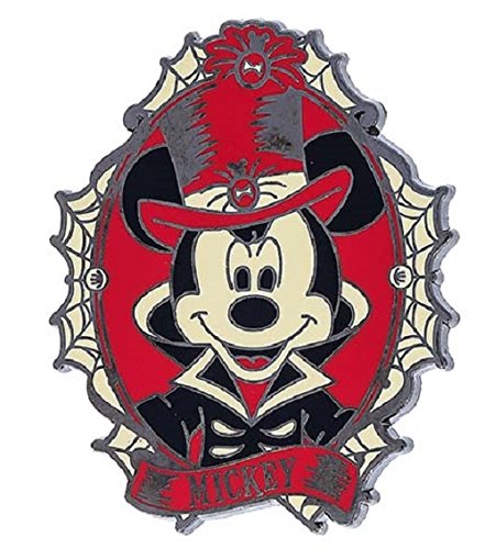 - Mickey Mouse is dressed for Halloween with a black and White suit and red hat adorned with spiders