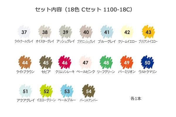 | セット内容 | ライトクールグレイ(37)、オイスターグレイ(38)、アッシュグレイ(39)、ブラウニッシュグレイ(40)、ブルーグレイ(41)、クリームイエロー(42)、ブリリアントイエロー(43)、ライトブラウン(44)、セピア(45)、クリムソンレーキ(46)、ペールピンク(47)、リーフグリーン(48)、バーミリオン(49)、ウルトラマリン(50)、アクアグレイ(51)、イエローグリーン(52)、ペールブルー(53)、バーントアンバー(54) (各1本) |