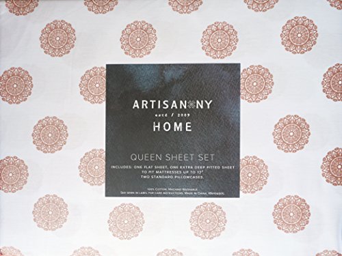 Artisan NY Bedding 4 Piece Cotton Queen Size Bed Sheet Set Deep Pockets Geometric Ethnic Round Medallions Mandala Pattern Bohemian Terra Cotta Pink