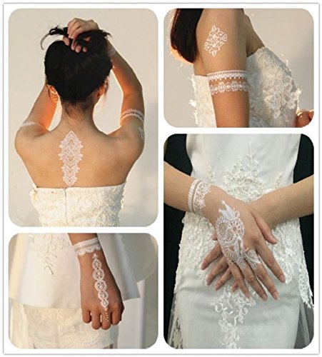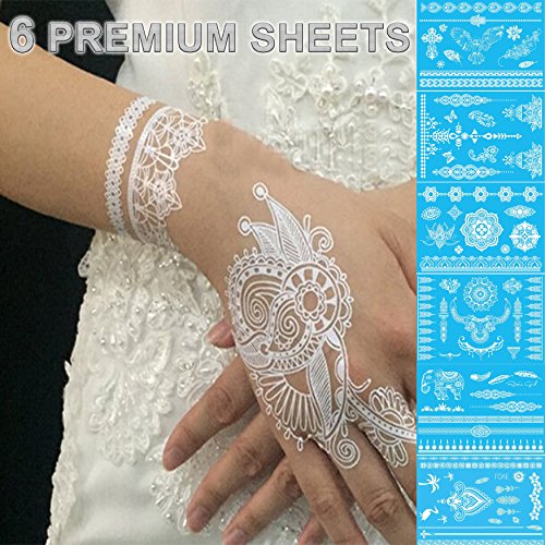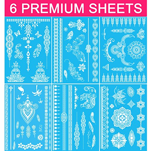 - FEATURES ASSORTED:All-In-One package of 6 sheets. Sheet size 6"x8".Over 72 tattoos coordinate perfectly with all the fashion trend like henna designs, flowers, arrows, bracelets & more,all in white lace design.