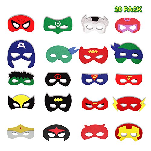 20 pieces superhero masks included superman, spiderman, iron man, hulk, captain America and more. Choose your favorite superhero and characters! Material: 100% felt, elastic headband