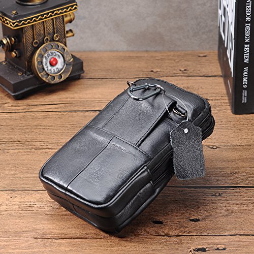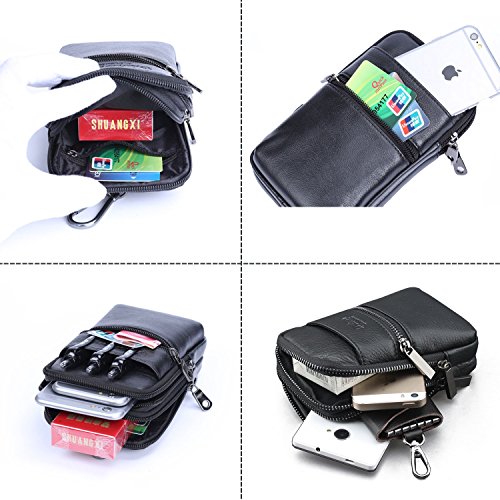 -. Feature : ◆This Bag is made of Genuine Cowhide Leather .The Cellphone Pouch fits your needs,The leather is full high quality that will last you for a very long time. / ◆It has 2 main zipper compartments for safe keeping, a front pocket for cellphone and a front zipper pocket,also has a Detachable shoulder strap,a carabiner and a belt loop.There's even a mini zipper pouch in the last compartment for smaller items like keys, cash, charger or for an ID card or credit card. / ◆The back of the cell phone pouch has a loop for your belt so you can wear it securely around your pants or a pair of shorts and a detachable shoulder strap aross your body. / ◆Its size approximately:7x 4x1.5 inch.You can put your cigarettes,lighter ,sunglasses,lipstick,etc and your phone inside and since your phone case has the slots for your cards, that is all you need. I think this would also make a great gift idea for someone who travels often. / ◆Package includes:1x Genuine Leather Belt Waist Bag , 1 xFree Classic Simple Elegant Durable Attachable Key Chain. You will be very surprised high quality of this key ring !