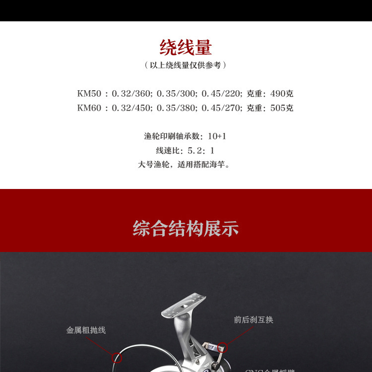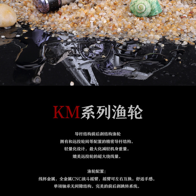 Front and rear brake wheel, equipped with 10 bearings, a one-way non-clearance bearings, alloy body quality better, more superior details, large winding volume throw farther, more accurate, anodized, more resistant to seawater corrosion! Large proportion of rocker handling more powerful!