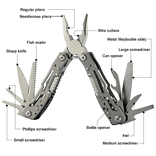 【12-in 1 Versatility】-- The multitool includes 12 integrated tools:Needlenose pliers, regular pliers, wire cutters, sharp knife, fish scaler, small screwdriver, phillips screwdriver, large screwdriver, metal file(double side), awl, medium screwdriver, bottle opener/can opener.