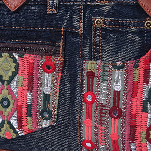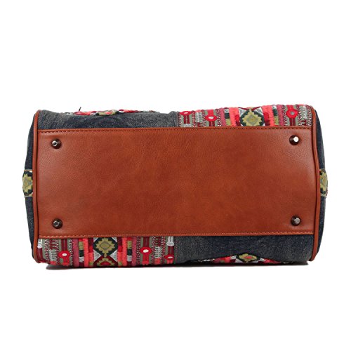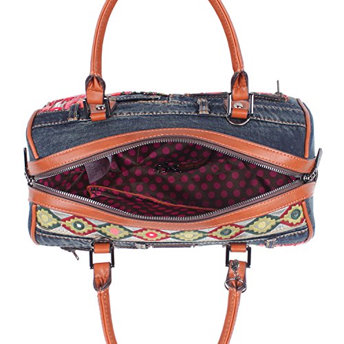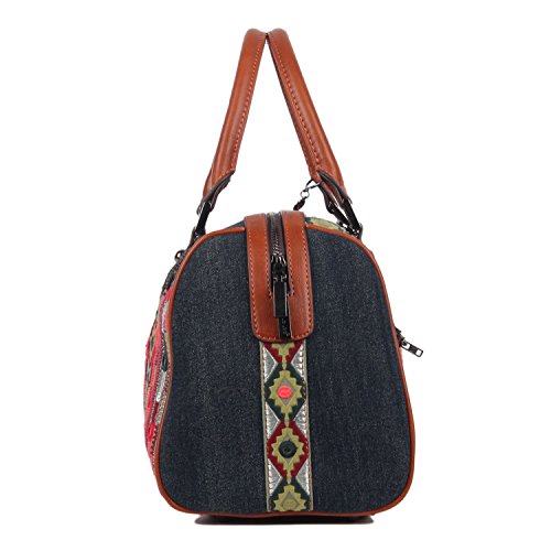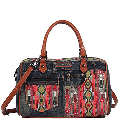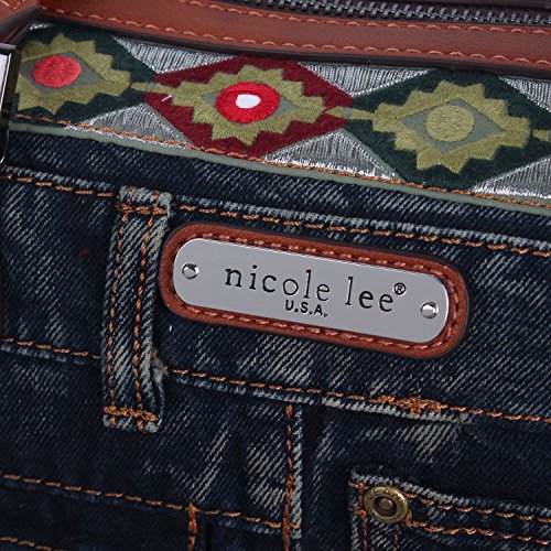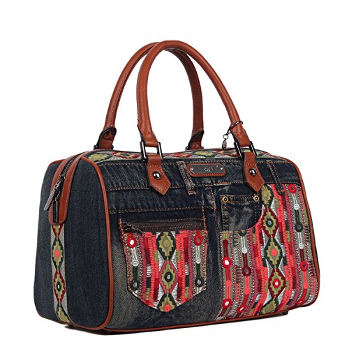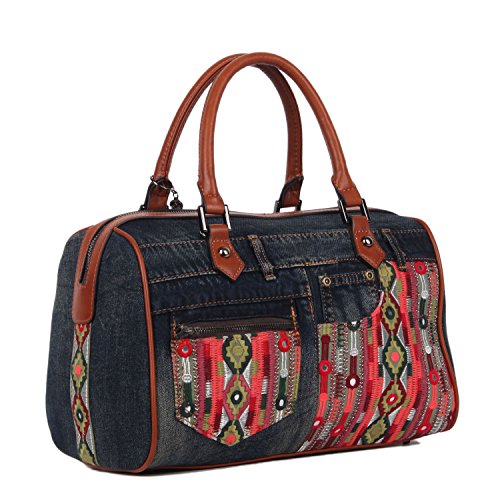 Product Description Get your bohemian look ready with the exclusive Nicole Lee Erla Denim Bohemian Boston Bag. Exterior Features: Made of denim with vegan leather trimming. This boston bag features patches of tribal fabric at front and back. Zip front pocket. Dual top handles. Zip back pocket. Metal zipper closure and NL monogrammed zipper pull. Detachable shoulder strap. Structured silhouette. Protective metal foot base and NL nameplate a front. Interior Features: Large open compartment with zip wall pocket with NL nameplate at back, vegan leather key chain strap, double open wall pockets at front and NL polka dot logo nylon lining. Vegan leather handles with 6" inch drop. Includes adjustable and detachable 44" - 53" inch shoulder strap. Color available Denim Bohemian. For cleaning, wipe with damp cloth. 0