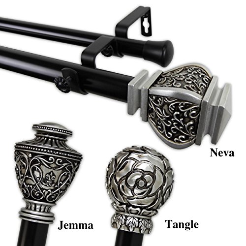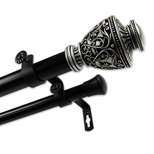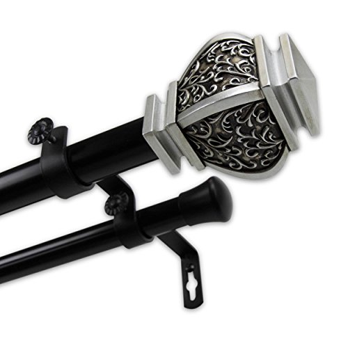 Studio : Window Trend Publisher : Window Trend Binding : Kitchen Product Description Customize your window style with this innovative Two Tone drapery rod. High quality steel comprises an elegant double rod perfect for rod with sheers applications using rod pocket or matching curtain rings for easy clip on panels. A crisp Black rod pairs with Satin Nickel finials to create a beautiful, dramatic look.FeaturesSet includes: Two (2) adjustable poles, mounting brackets, two (2) end caps on rod and two (2) finialsRod construction: 28-48 inch, 48-84 inch and 66-120 inch are one telescoping adjustable pole, 120-170 inch is a 3-piece telescoping pole, 160-240 inch is a 4-piece telescoping poleChoose from one of the finials - (1) Jemma Finial Size: 3-1/2 inches wide x 2-1/4 inches high x 2-1/4 inches deep (2) Tangle Finial Size: 3-7/8 inches wide x 2-1/2 inches high x 2-1/2 inches deep (3) Neva Finial Size: 3-1/2 inches wide x 2-3/8 inches high x 2-3/8 inches deep Diameter: 1 inch diameter front pole and .75 inch back poleBrackets quantity: 28-48 inch (2 pieces), 48-84 inch (3 pieces), 66-120 inch (3 pieces), 120-170 inch (4 pieces), 160-240 inch (5 pieces)Double brackets projection: 3-3/4 inch wall to back rod (the one closer to the wall), 6-3/4 inch wall to front rod (the one further to the wall)Materials: Steel rods, brackets, and resin finialsThe digital images we display have the most accurate color possible. However, due to differences in computer monitors, we cannot be responsible for variations in color between the actual product and your screen. 0