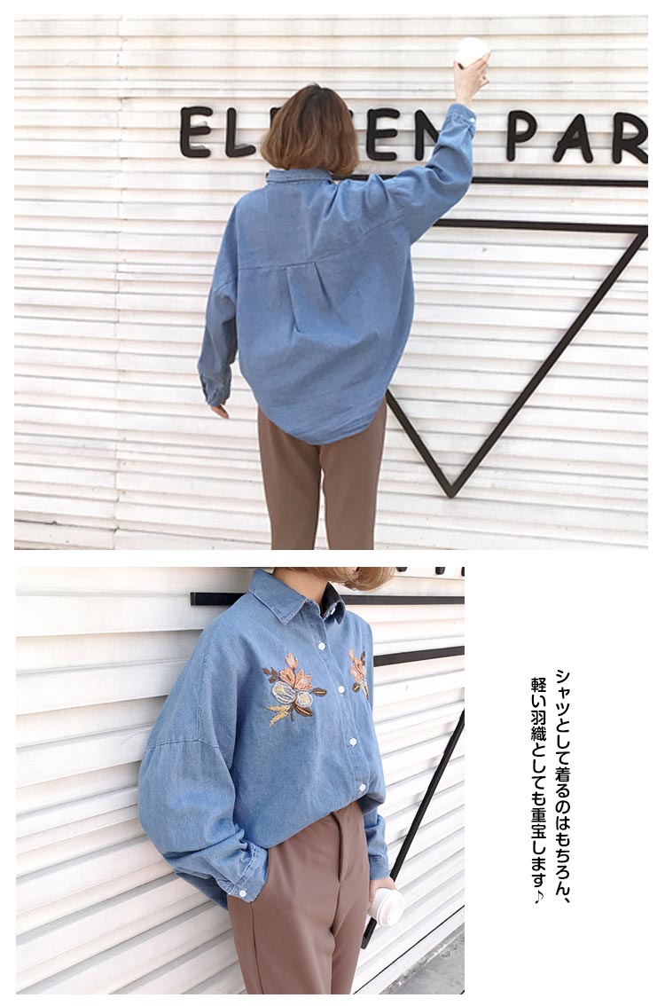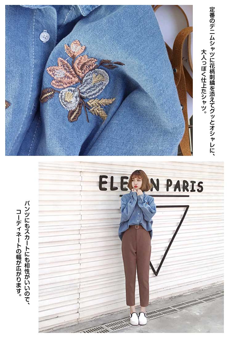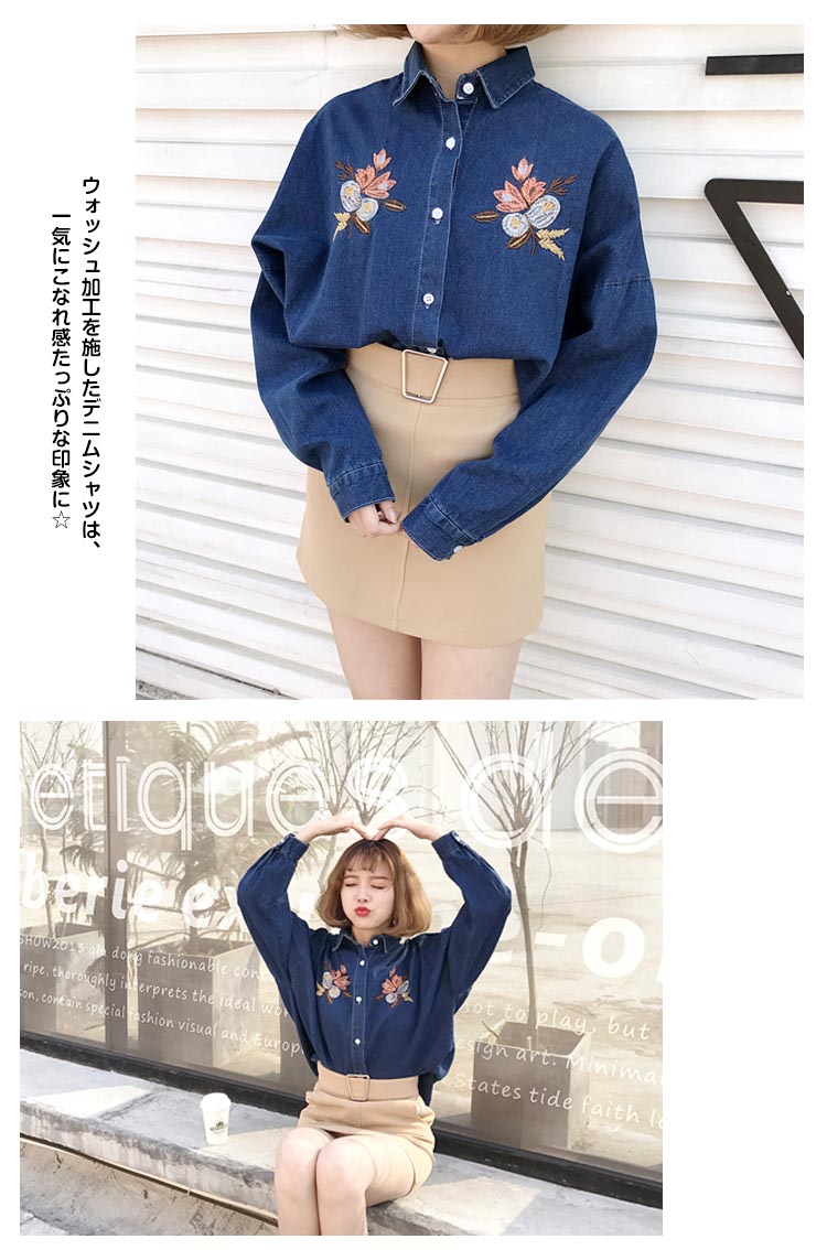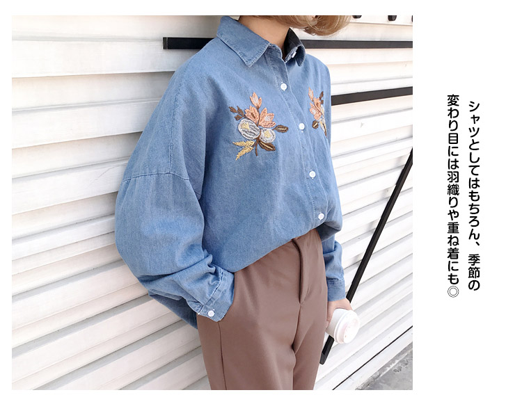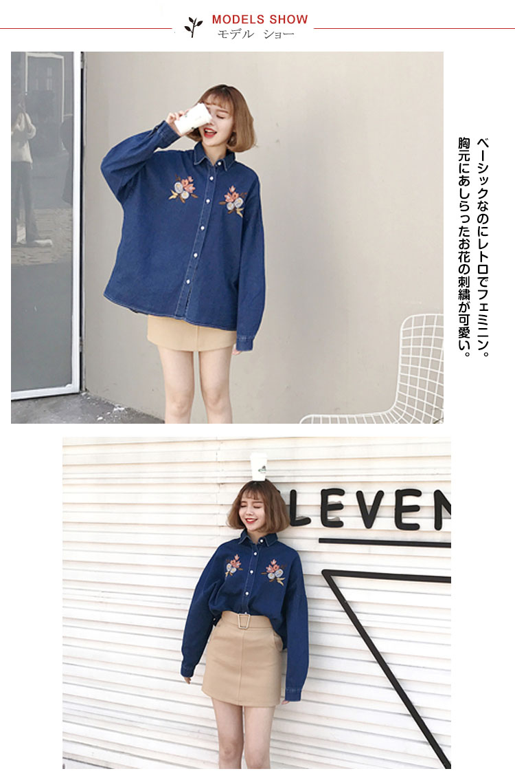 | ベーシックなのにレトロでフェミニン。胸元にあしらったお花の刺繍が可愛い。ウォッシュ加工を施したデニムシャツは、一気にこなれ感たっぷりな印象に☆シャツとして着るのはもちろん、軽い羽織としても重宝します♪ | |