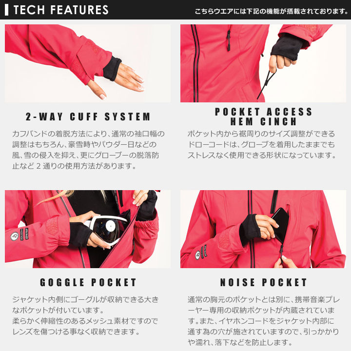 全身に保温性の高い80gmロウロフトインサレーションを施し、寒さの厳しいハイシーズンのゲレンデでも温かさをキープ。