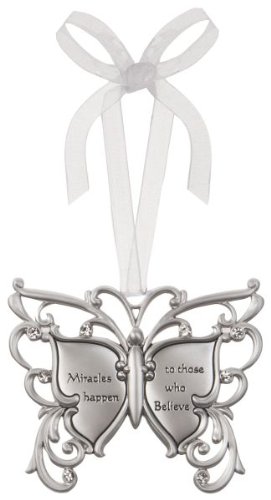-. Binding : Kitchen -. Brand : Ganz -. Color : Grey -. EAN : 0661371438467 -. Feature : Filigree Butterfly Ornament with engraved inspirational verse. / Great to hang In Car, In the House, on the Christmas Tree - Anywhere! / Make wonderful housewarming and hostess gifts! / Top gifts and presents with these special extras! / White Satin Ribbon Attached. Size approx. 2 3/4" W. x 2 1/8" H -. Label : Butterfly Blessings Ornaments -. Manufacturer : Butterfly Blessings Ornaments -. Model : ea14442 -. MPN : ea14442 -. PackageQuantity : 1 -. PartNumber : ea14442 -. ProductGroup : Home -. ProductTypeName : HOME -. Publisher : Butterfly Blessings Ornaments -. Studio : Butterfly Blessings Ornaments -. Title : Miracles Happen To Those Who Believe Butterfly Silver & Crystal Filigree Ornament -. UPC : 661371438467